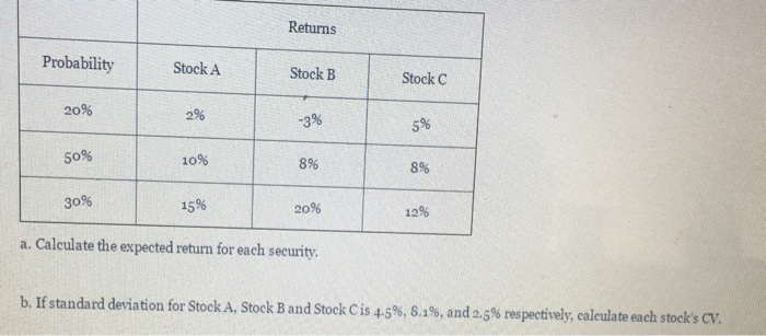 For asset return and volatility data see below. See full list on educba.com Let's take an example to understand the calculation of the expected return formula in a better manner. See full list on educba.com Press enter, and your expected. First one has to calculate the mean of all returns. Here we discuss how to calculate expected return along with practical examples. This summation is the expected return of your single investment. The expected return on a risky asset, given a probability distribution for the possible rates of return. Hence investors must take into account this risk which is calculated by measures such as standard deviation and variance. It is a measure of risk that needs to be taken into account by investors. Additional information on volatility can be found in the volatility primer. Plus a 50%, or.5, probability times a 10%, or.1, return;